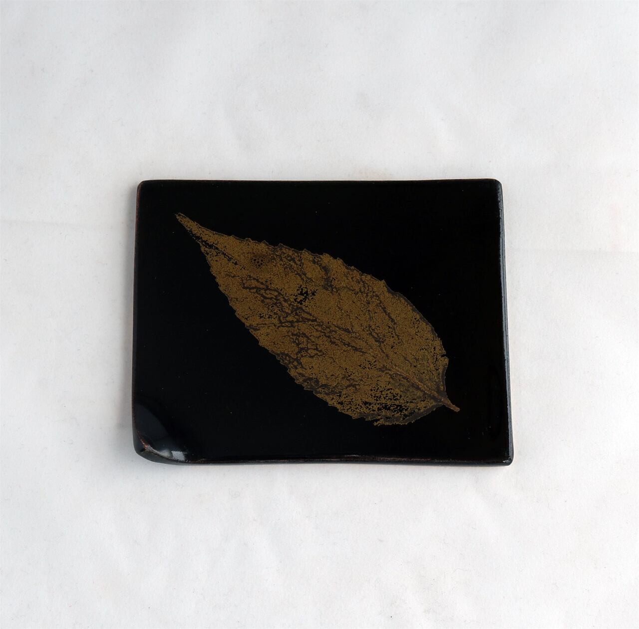 金茶色のムクの葉が、ツヤのある黒地に美しく映える木の葉天目の角皿です。「黒天目釉」を掛け、独自の技法を施したムクを配して焼き上げました。